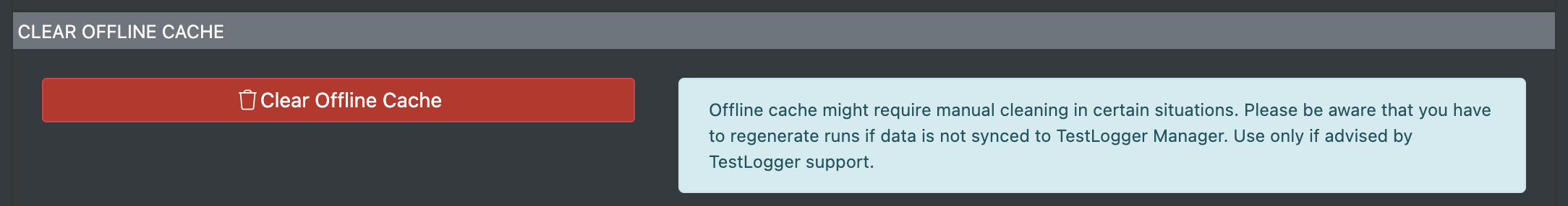 If you operate under offline mode, then Connector will sync all your generated runs to TestLogger after the internet connection recovers. Sometimes there might an issue with the sync and by using this function you can clean the cache and start from clean table.