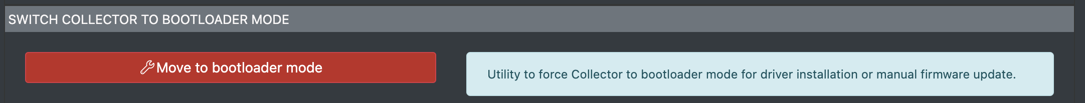 This function enables to you move Collector to bootloader mode directly from Connector. This function can be used for example during bootloader driver installation for Windows or alternatively if you need to manually update the device firmware.