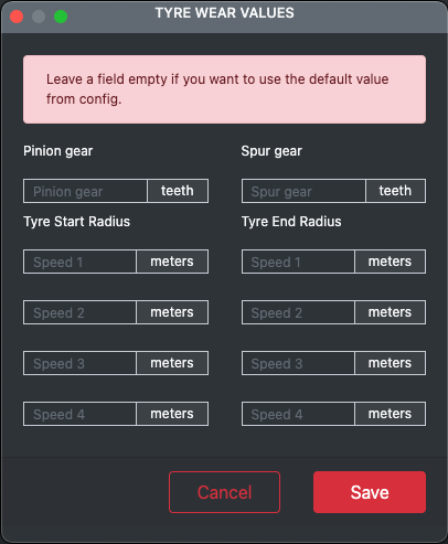 When this functionality is enabled, you will receive an additional popup window after loading a data file. In this form you can fill new values pinion and spur as well as for tire diameters.